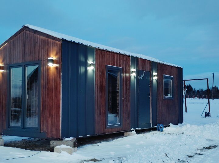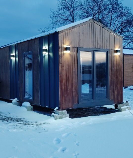 Przytulny domek letniskowy na sprzedaż. Metalowa konstrukcja z dużymi oknami zapewnia doskonałe doświetlenie wnętrza. Idealny na weekendowe wypady lub krótki wypoczynek na łonie natury.